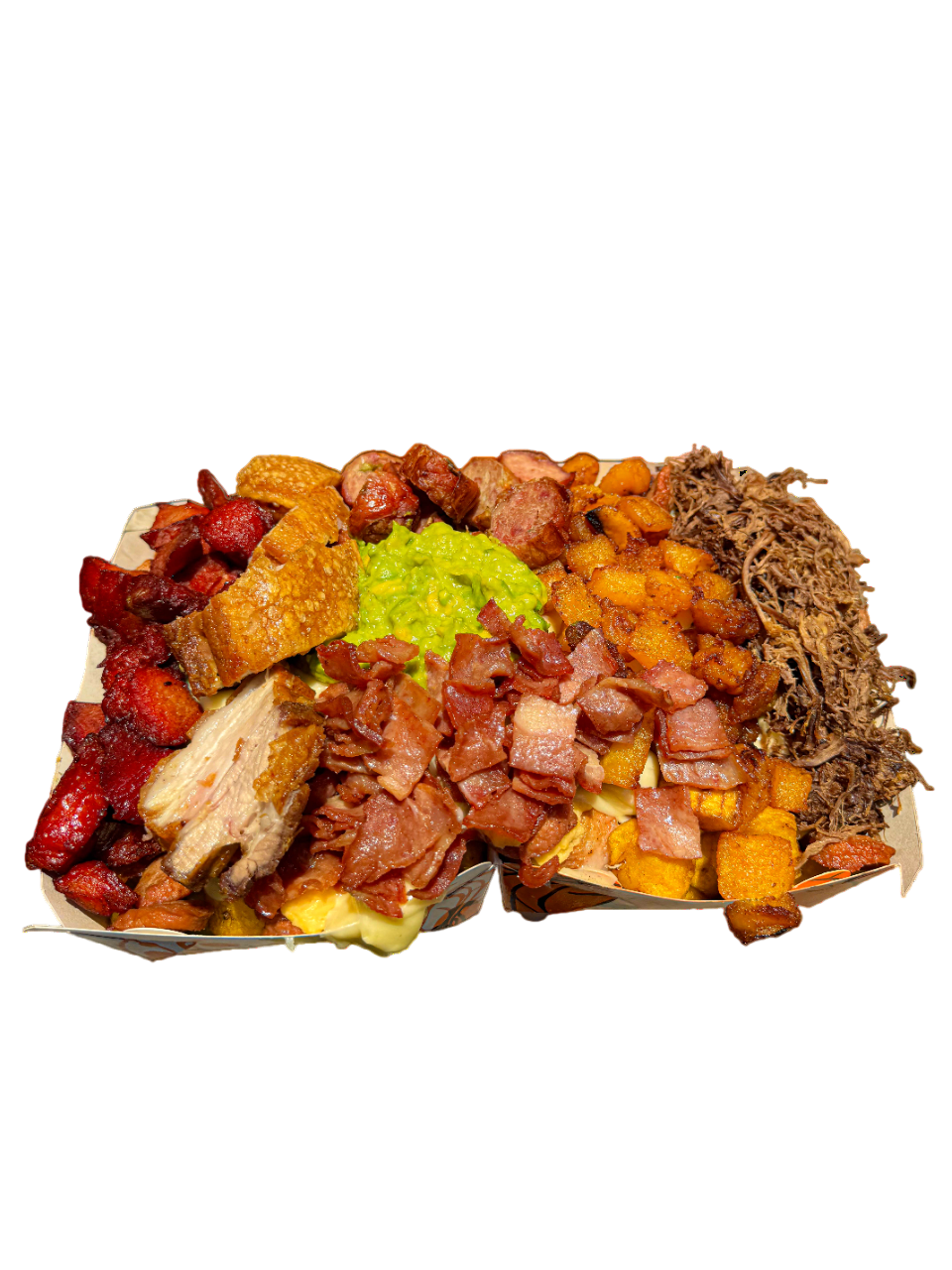picada para 3 personas 2209 gr ,papa amarilla,salchicha premium,queso gratinado,bacon, maduro guayabo premium,chicharron con limon pimienta, costilla ahumada en salsa bbq honey ,carne desmechada en sa