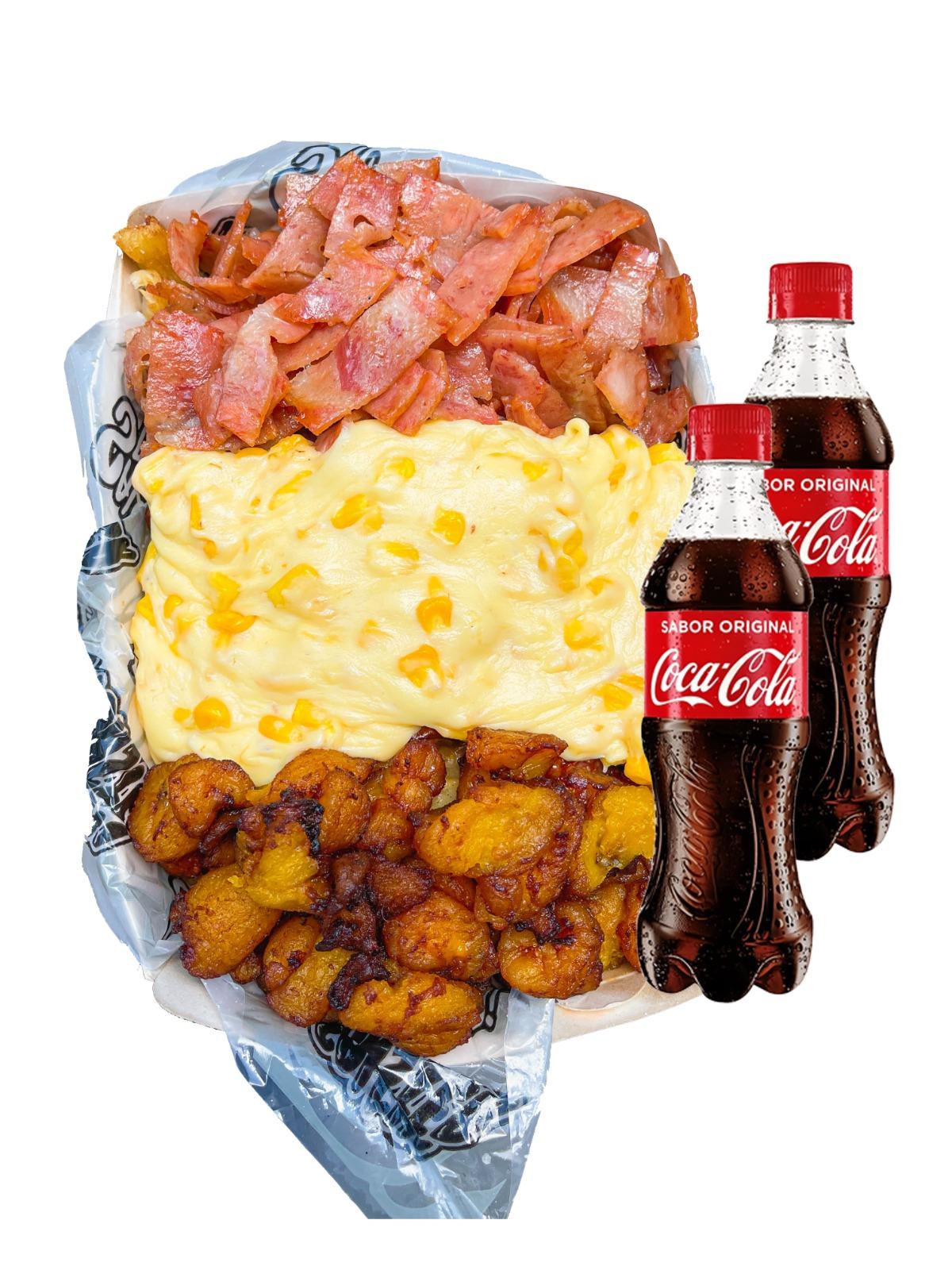 salchipapa 1264 gr para 2 personas ,papa amarilla, salchicha premium , queso gratinado, maicitos,maduro guayabo,bacon y salsas verde,ajo,bbq honey + 2 bebidas 250 ml gratis