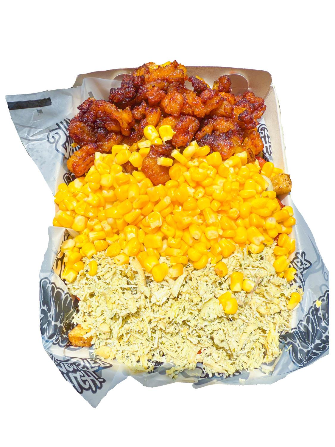 salchipapa personal 792 gr , papa amarilla,salchicha premium,queso gratinado,pollo desmechado con chimichurri,maduro guayabo , maicitos y salsas verde,ajo ,bbq honey