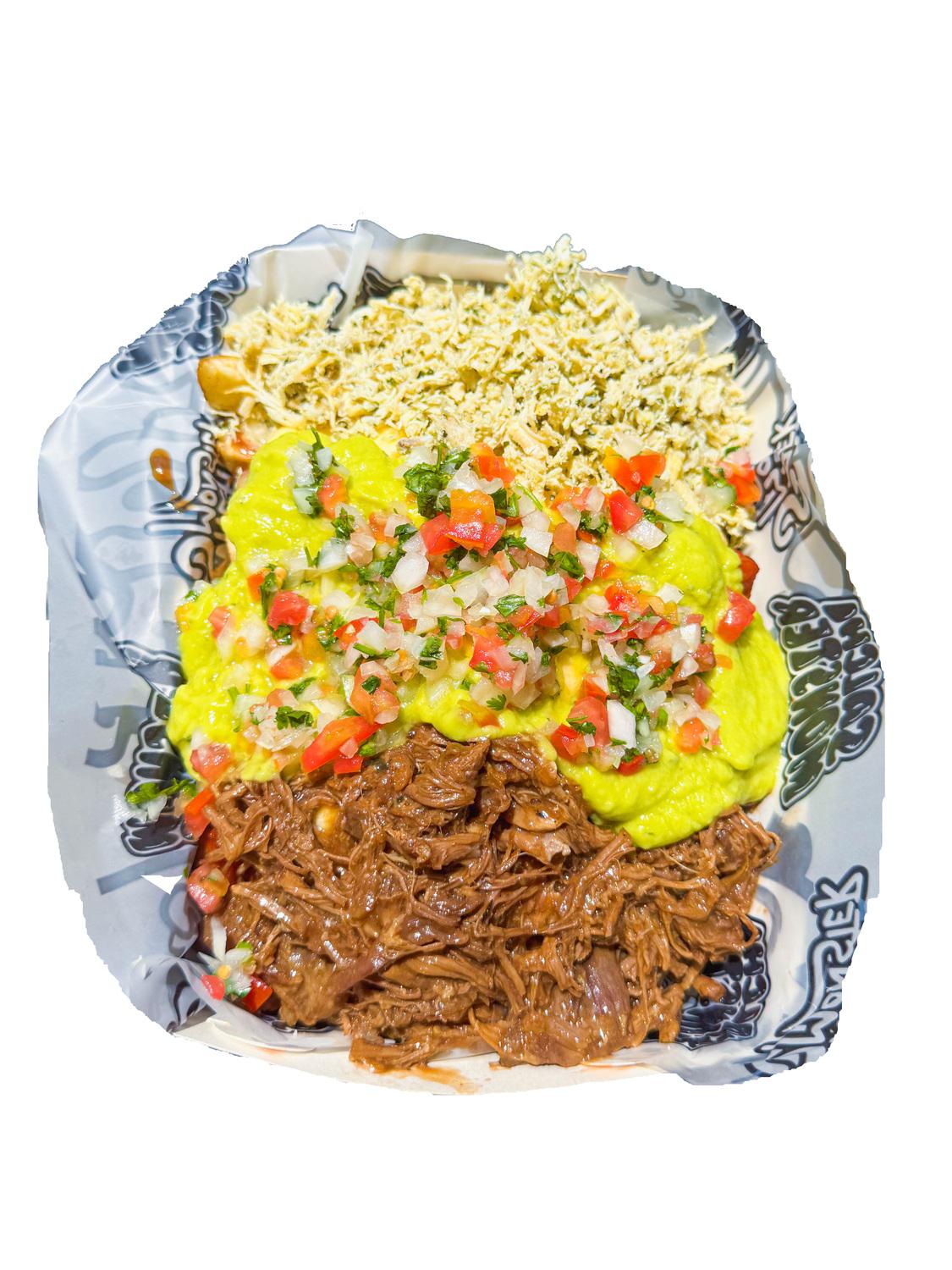 salchipapa 1264 gr para 2 personas ,papa amarilla,salchicha premium,queso gratinado, carne desmechada en salsa bbq honey,pollo desmechado con chimichurri,guacamole,pico de gallo. y salsas verde,ajo,bb