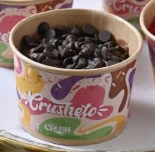 postre: torta de chocolate con helado de fresa, salsa de chocolate y chips de chocolate